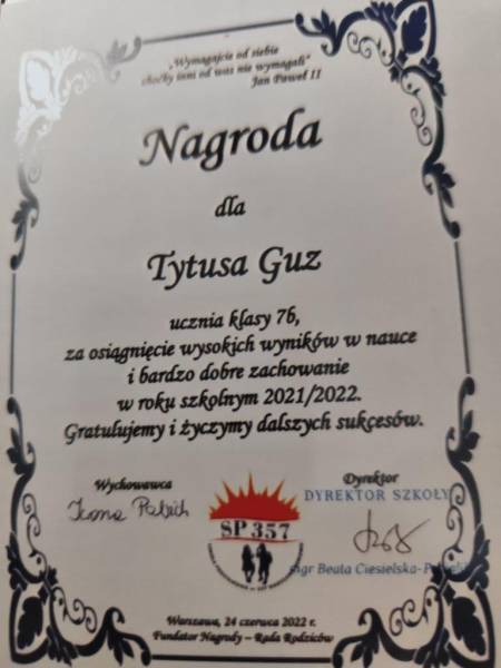 TYTUS GUZ- wspaniały, wyjątkowy nastolatek Szk.Podst.nr 357 w Warszawie ukończył świadectwem z paskiem, nagrodą i stypendium naukowym. Był uczniem ambitnym, sumiennym, zdyscyplinowanym. Uczestniczył w konkursach przedmiotowych, przez 5 lat w tworzeniu gazetki szkolnej. Do każdego numeru z łatwością pisał teksty o różnej tematyce. Pięknie rysował, malował na lekcjach plastyki i dla relaksu. Matematyka i fizyka były ulubionymi przedmiotami i tym kierował się podejmując decyzję o kontynuacji nauki.