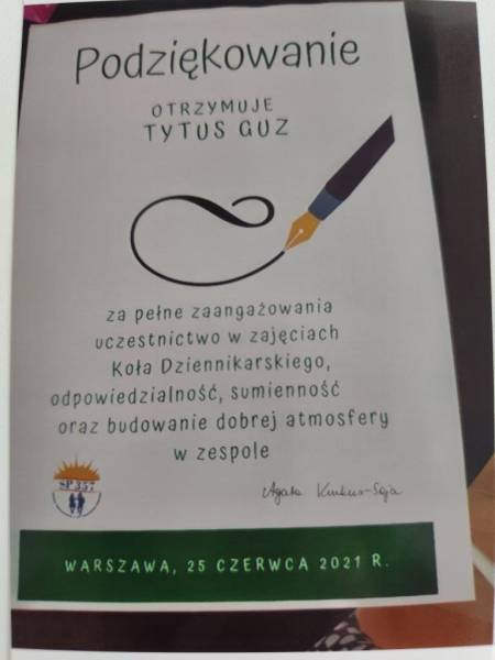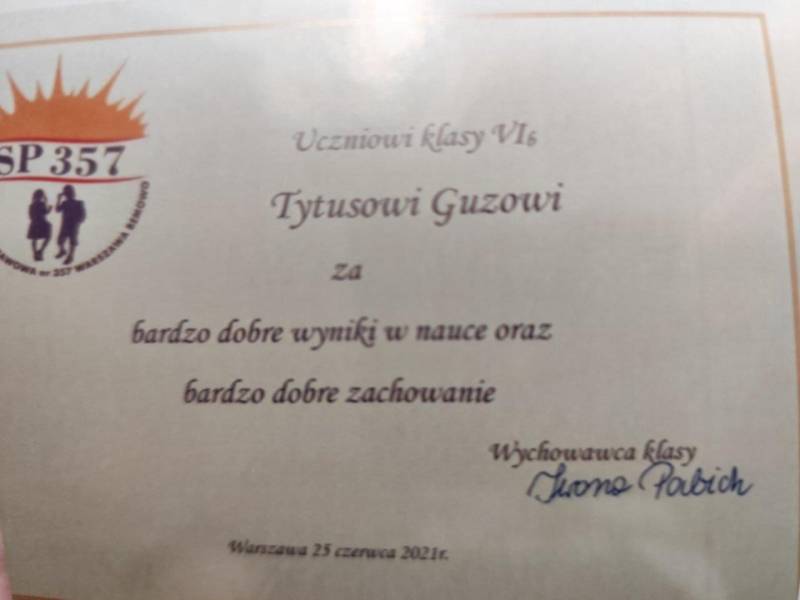 TYTUS GUZ- wspaniały, wyjątkowy nastolatek Szk.Podst.nr 357 w Warszawie ukończył świadectwem z paskiem, nagrodą i stypendium naukowym. Był uczniem ambitnym, sumiennym, zdyscyplinowanym. Uczestniczył w konkursach przedmiotowych, przez 5 lat w tworzeniu gazetki szkolnej. Do każdego numeru z łatwością pisał teksty o różnej tematyce. Pięknie rysował, malował na lekcjach plastyki i dla relaksu. Matematyka i fizyka były ulubionymi przedmiotami i tym kierował się podejmując decyzję o kontynuacji nauki.